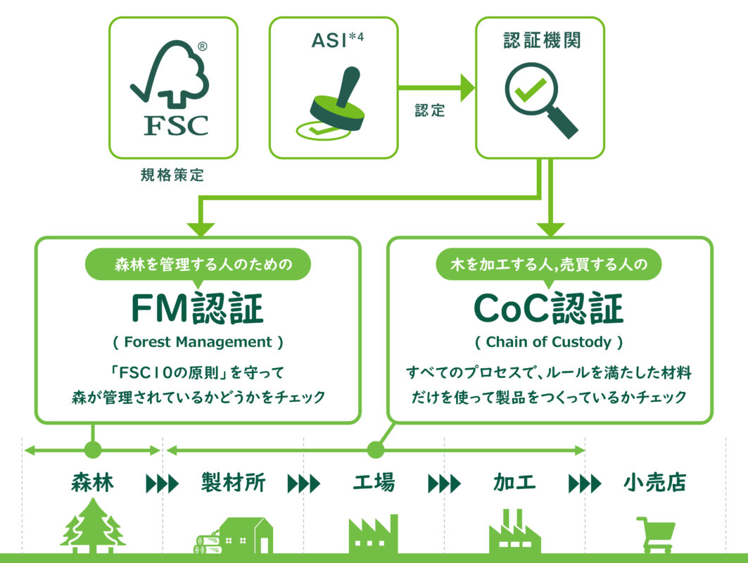 FSCの認証は、森林の管理を認証するFM(Forest Management)認証と、加工・流通過程の管理を認証するCoC(Chain of Custody)認証の連鎖から成り立っています。FSC認証製品が消費者の手に届くまでには、最終製品になるまでの生産、加工、流通に関わるすべての組織が認証を受けなくてはなりません。また、FSC認証の審査・発行は、FSCではなくASI※から認定を受けた独立した第三者の認証機関が行います。